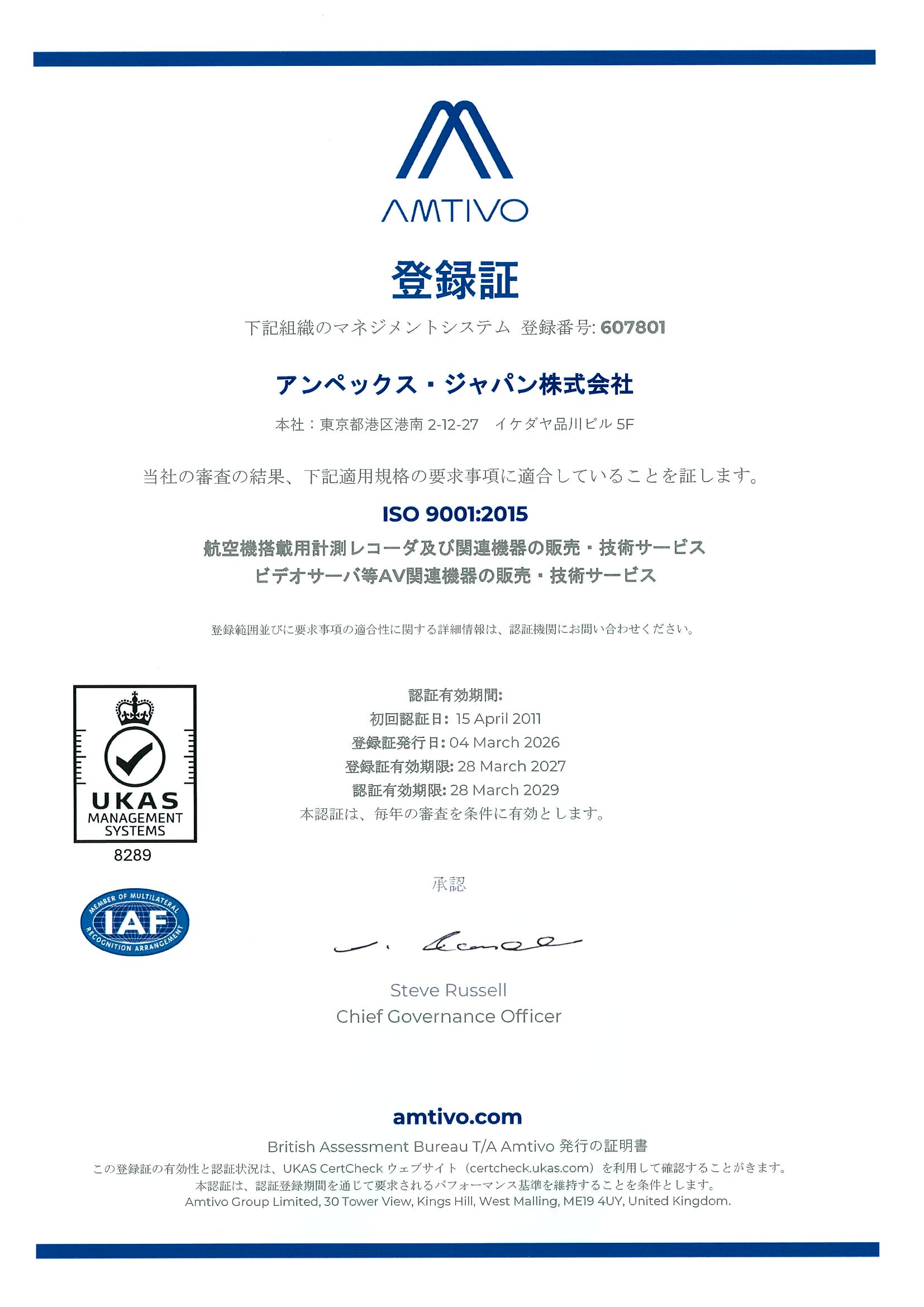 アンペックス・ジャパンの管理体制が評価され、下記の活動に於いて2025年のISO 9001:2015が継続承認されました。